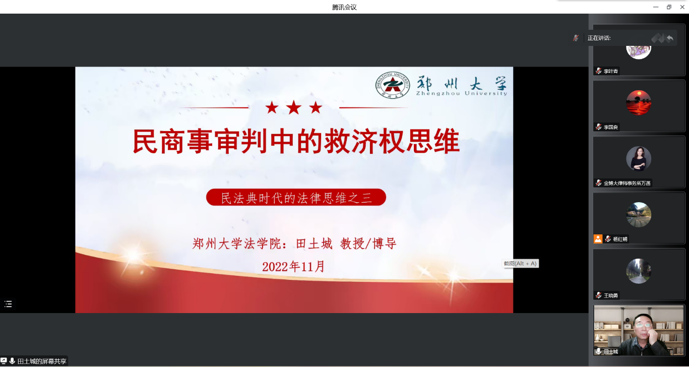 为了培养学生思维能力,深入了解民法典的法律逻辑, 11月16日晚,暗网视频通过线上会议的方式举办以“民商事审判中的救济权思维”为主题的学术报告。本次报告由郑州大学田土城教授主讲,暗网视频部分学生参与。会议由院长王晓勇主持。