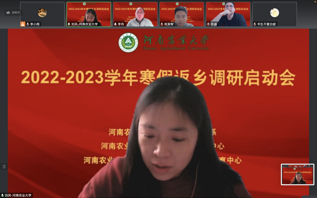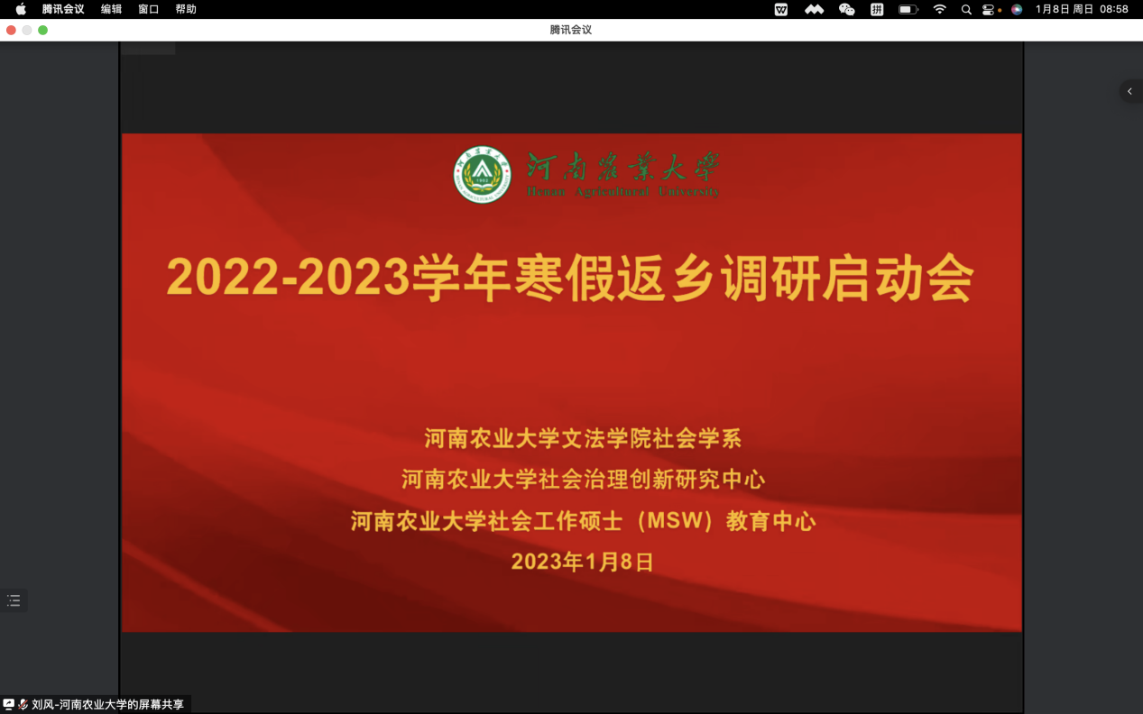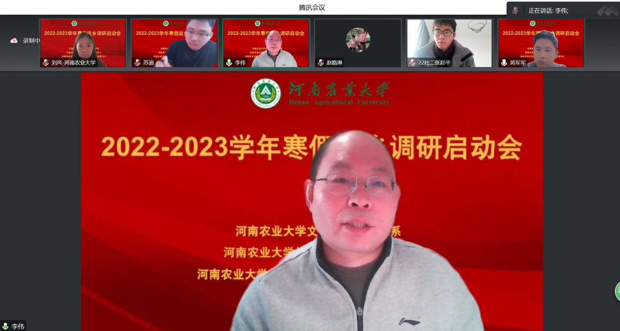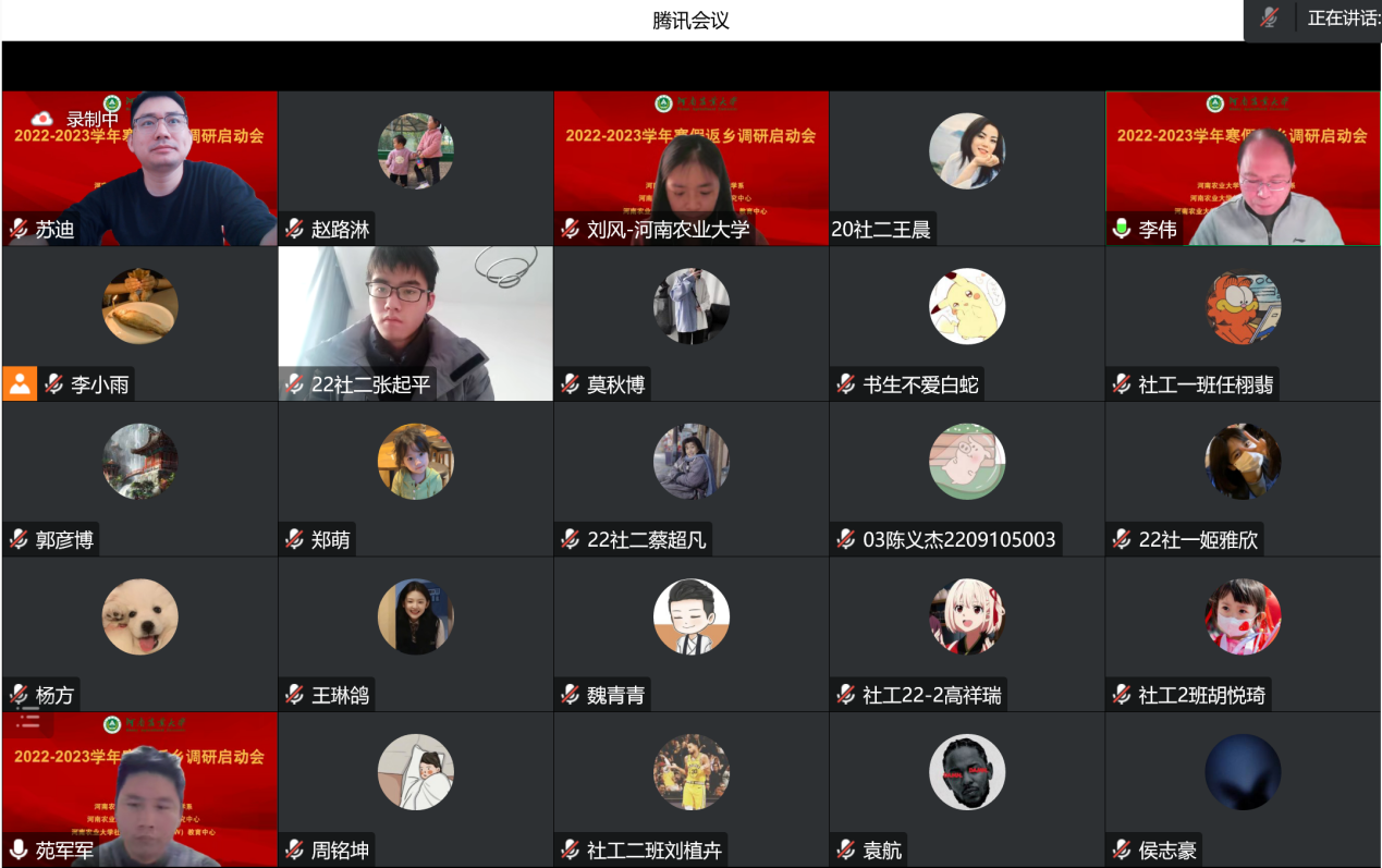 为迎合党和国家对高校高质量教育的要求、对准国家乡村振兴等重大发展战略,结合社会工作专业本科生、研究生的培养目标以及社会学系老师的研究方向,暗网视频社会学系通过线上形式举办了大学生寒假返乡调研启动会。会议由社会学系副主任刘风主持,副院长李伟,社会学系教师代表参加,2022、2021、2020、2019级的部分本科生、研究生报名参与调研活动。