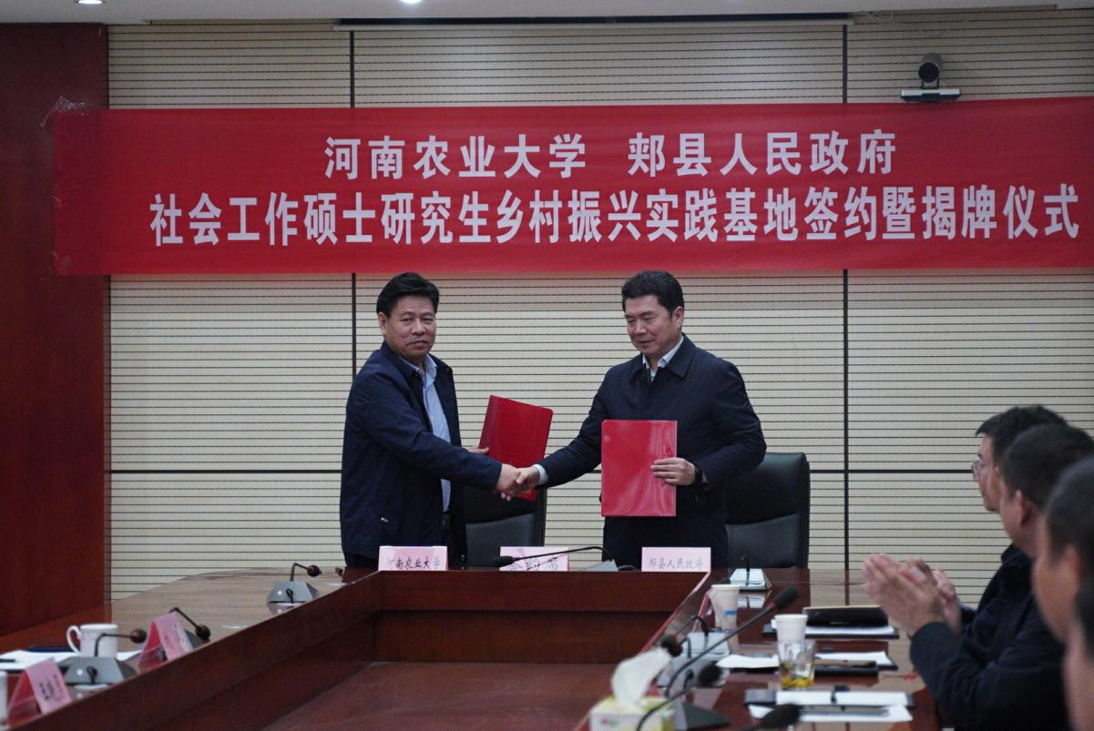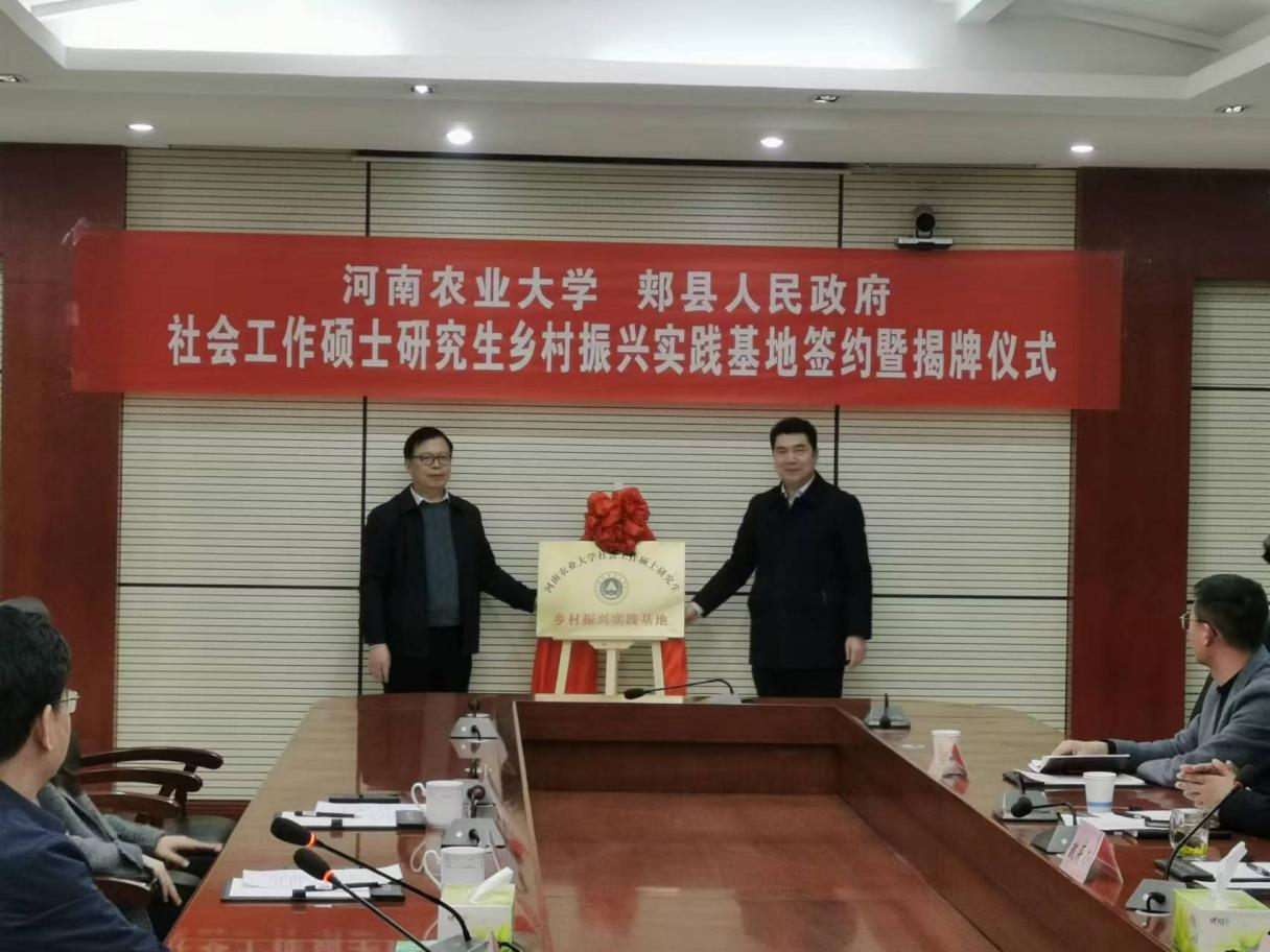 仪式上,宋安东与李政杰签订了合作协议,王晓勇与李政杰为“河南农业大学社会工作硕士研究生乡村振兴实践基地”揭牌。