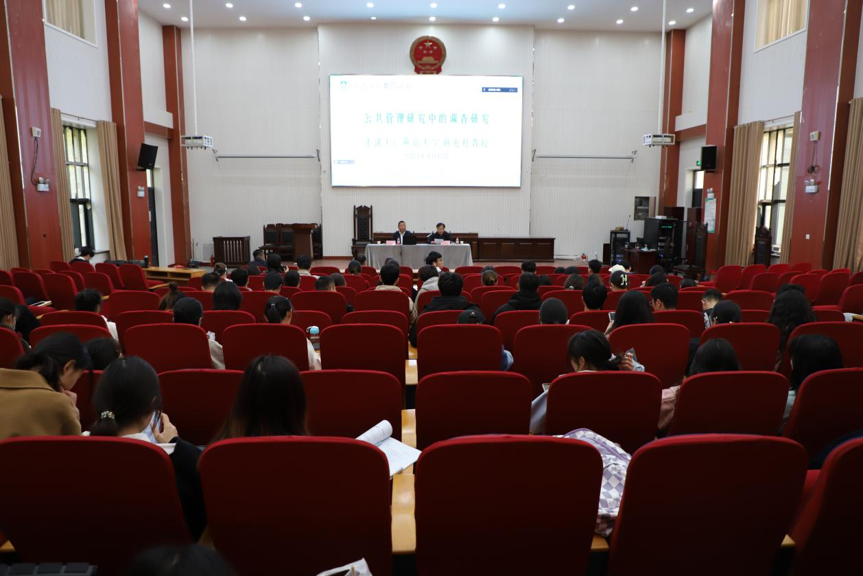 部分师生参加报告会。韩兆柱从党中央号召大兴调查研究之风的重要意义引入,结合自己参加公共管理案例大赛的赛经历,阐述了公共管理专业开展调查研究的方法与技巧,分析了在实地调查过程中遇到的困难与障碍。他讲到,社会科学研究离不开调查研究,社会科学研究在于解释社会现象和规律,帮助人们了解社会状况,制定和实施有效的政策,促进社会和谐发展。他指出,我国一直坚持调查研究工作,在社会主义革命与建设时期,调查研究工作具有不可替代的根本性作用。他强调,文科生要想提高自己的学术能力,要真正扑下身子,深入实践,才能求得真知。