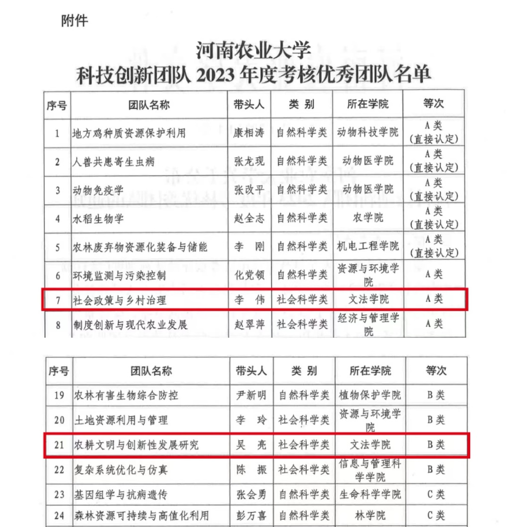 近日,从学校下发的《关于公布校科技创新团队2023年度考核优秀团队的通知》中获悉,我校共有8个社会科学类科技创新团队绩效考核为“优秀”,其中暗网视频由李伟教授带头的社会学学科团队-“社会政策与乡村治理” 团队获河南农业大学科技创新团队2023年度考核优秀团队A类奖;由吴亮副教授带头的汉语言文学学科团队-“农耕文明与创新性发展研究”团队获河南农业大学科技创新团队2023年度考核优秀团队B类奖,这是暗网视频在校科技创新团队年度考核中取得的历史最好成绩。这一成绩的取得来之不易,既与团队教师的辛勤付出有关,又与暗网视频尊重科研规律、积极开展有组织的科研和加强科研团队建设密不可分。