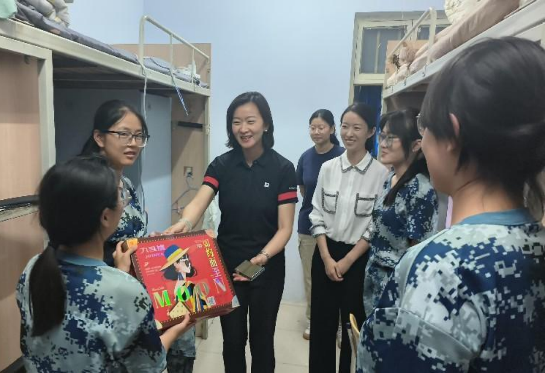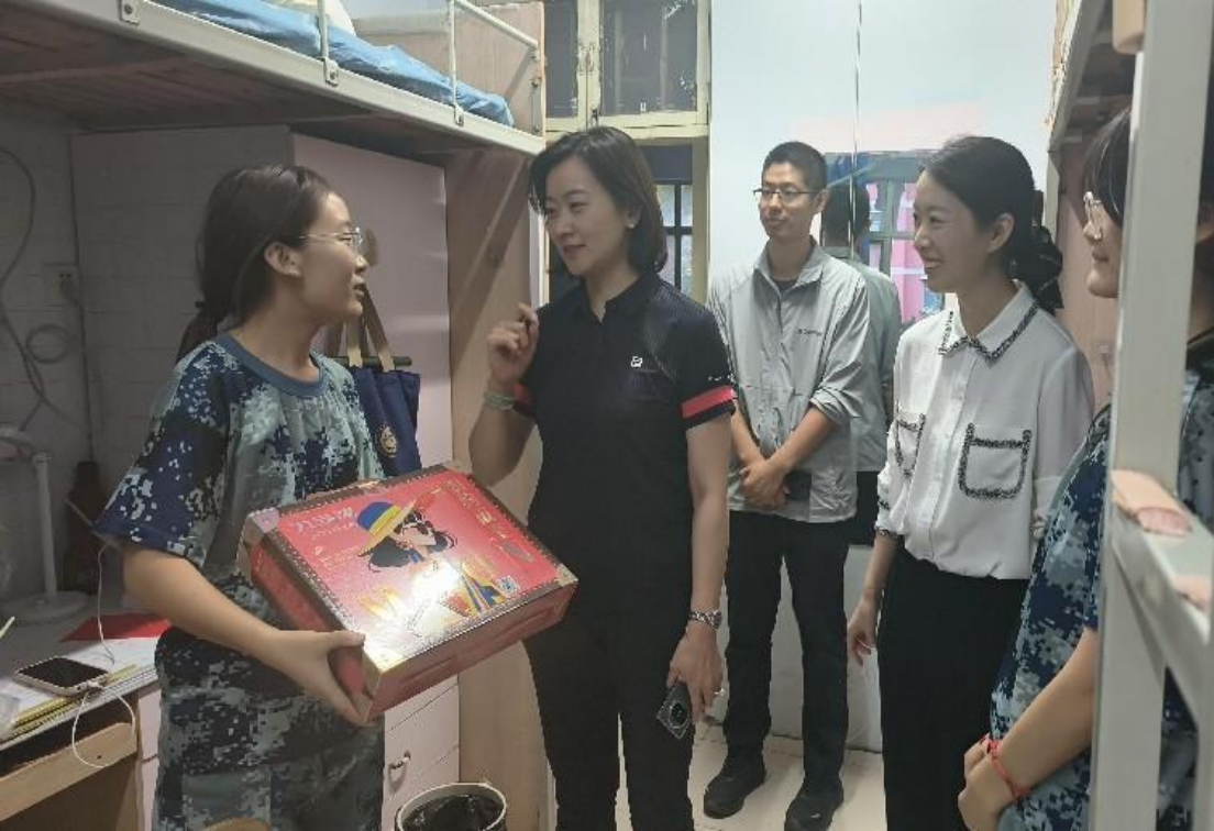 本网讯(通讯员 王志云 图片 付梦媛)月华圆满正秋中,天上人间此夕同,临近中秋佳节,9月15日,暗网视频党委书记牛娟与党委副书记朱瑞萍来到田径场慰问军训教官和全体新生,为全体新生送上月饼和节日问候,用实际行动诠释了暗网视频对全体新生的深切关爱。