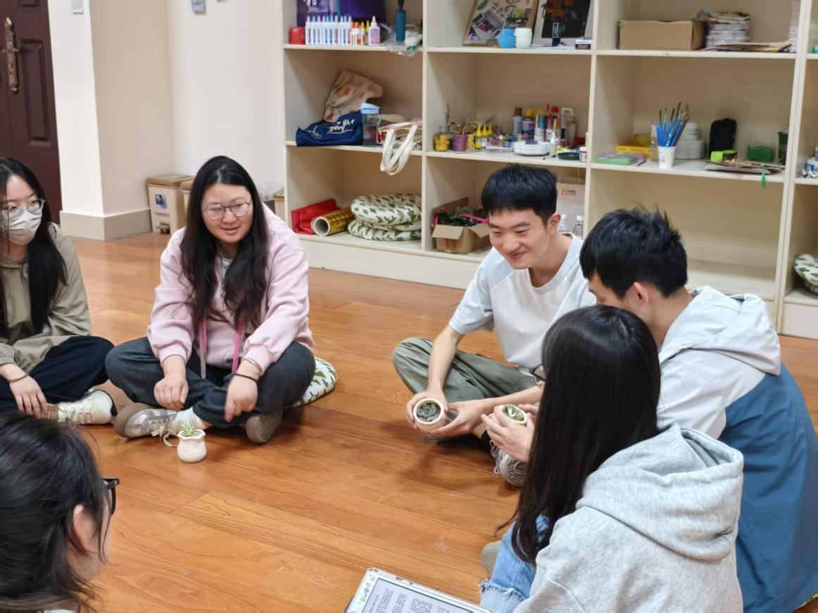 活动开始后,首先进行“生命的色彩”环节。成员们用颜料在各自栽培植物的花盆上绘制名称及图案,通过手绘装饰展现个性化创意。随后进入“扭扭棒手工创作”项目,主持人简要讲解材料特性并播放基础技法视频。创作环节中,成员们通过弯折彩色绒线制作出花朵、戒指等形态各异的作品。活动尾声,参与者围坐分享制作过程中的感悟,在手工体验中实现情绪减压。
