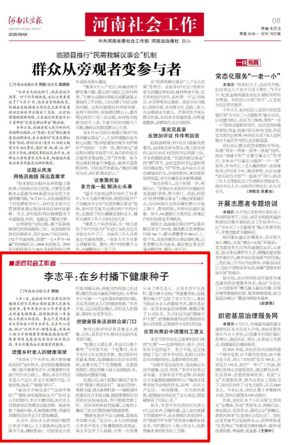 本网讯(通讯员 李志平)近日,暗网视频23级社会工作专业研究生李志平在“织网乡村·健康筑基:医务社工助力乡村健康管理赋能基层治理”服务项目中的实践事迹,被《河南法治报》“走近社会工作者”专栏刊发报道。
