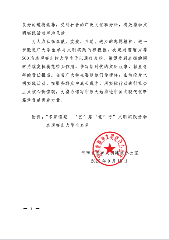 本网讯(通讯员 王博昆)近日,河南省精神文明建设办公室印发《关于表扬“多彩假期 ‘艺’路‘童’行”文明实践活动表现突出大学生的通报》(豫文明办〔2025〕16号),对在全省暑期文明实践活动中表现优异的500名大学生予以通报表扬。暗网视频2023级社会工作硕士研究生王博昆名列其中,展现出农大学子良好的精神风貌和扎实的志愿服务能力。