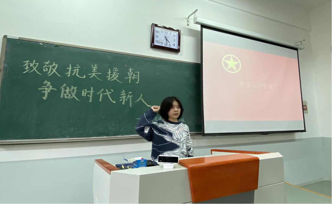 为纪念抗美援朝七十周年,秉持丰富活动形式,帮助学生深层次、全方位、多领域理解和宣传抗美援朝战争光荣历程和伟大胜利的理念,此次团日活动特邀请学生党员代表进行演讲。学生党员代表赵和旺以电影《金刚川》为切入点为学生讲解抗美援朝这段伟大历史事件,同时引入习近平纪念中国人民志愿军抗美援朝出国作战70周年大会的重要讲话展现中华民族奋进新征程的无比坚定、无比自信;学生党员代表王晓钶结合抗美援朝的历史背景,进而阐述纪念抗美援朝战争胜利七十周年的重要意义。