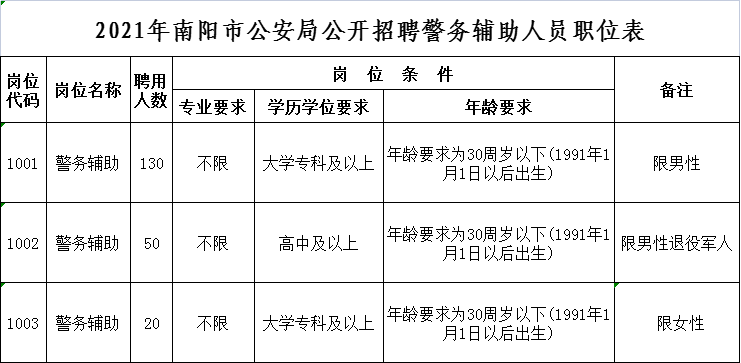 招聘警务辅助人员200名,其中男性180名(退役军人50名)、女性20名。招聘岗位为南阳市公安局交通管理支队交通管理执勤辅助人员(交警铁骑队)。
