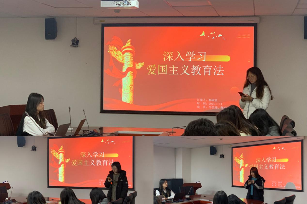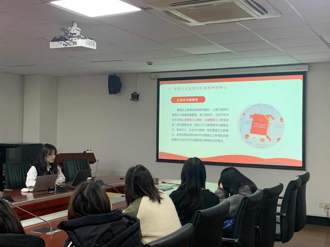 活动第一个环节由第四党小组代表杨淑贵同学进行分享汇报,分享内容主要分为四部分:爱国主义教育法的立法经过、爱国主义教育法的重点内容、爱国主义教育法的立法意义以及新时代爱国主义教育法的践行路径等。杨淑贵同学提到:爱国主义教育法的制定和施行,凸显了新时代爱国主义教育的重要性。我们要时刻保持初心,牢记使命,将爱国主义精神贯穿于学业和社会实践之中。我们应不断追求卓越,立足本职岗位,为培养更多具有家国情怀的优秀人才而努力奋斗。