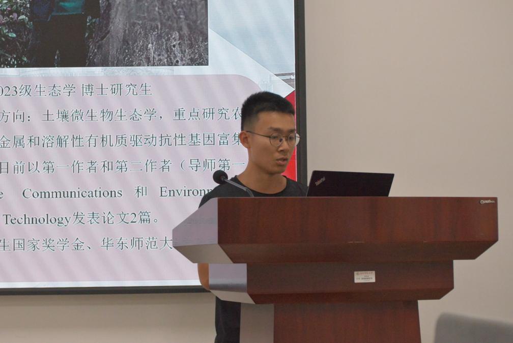 第二位分享的是2023级博士研究生刘子腾同学,主要研究方向是土壤微生物生态学,重点研究农业土壤中金属和溶解性有机质驱动抗性基因富集的机制。成果发表在Nature Communications, Environmental Science & Technology期刊上。刘子腾同学从自身经历出发,围绕申博经验、科研心得、写作经验这三个方面分享了他在博士生阶段的感悟与收获,并鼓励同学们在校期间,勇攀科研高峰,力争发表高水平论文。
