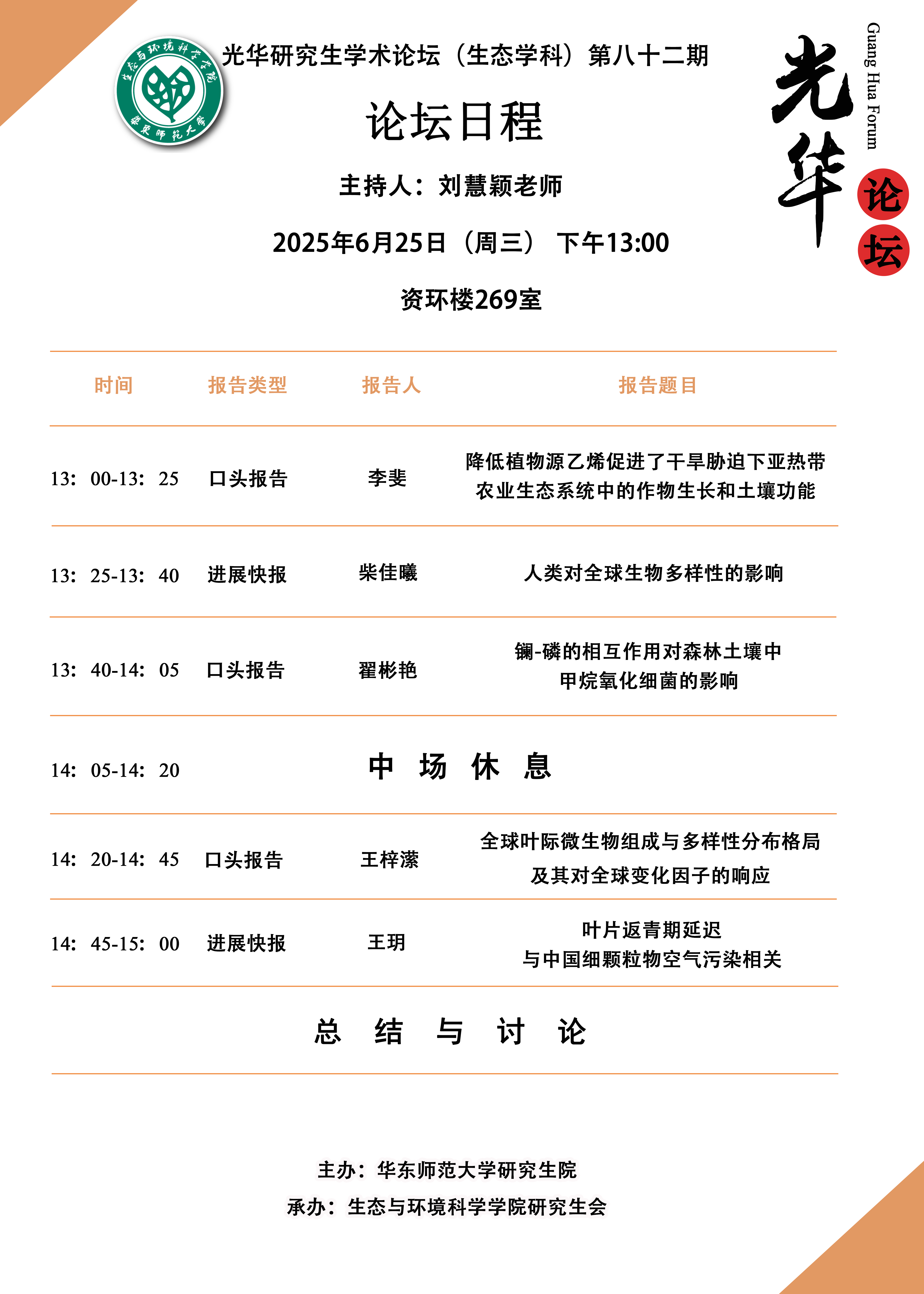 上半场的第一位汇报人是来自周小奇老师课题组的李斐同学,她口头报告的题目是《降低植物源乙烯促进了于旱胁迫下亚热带农业生态系统中的作物生长和土壤功能》,研究回答了干旱诱导植物产生的乙烯如何影响农业生态系统的作物生长、土壤功能、土壤微生物群落等一系列重要科学问题。第二位汇报人是来自黎绍鹏老师课题组的柴佳曦同学,他进展快报的题目是《人类对全球生物多样性的影响》,该研究人类压力没有导致系统性群落同质化, 但会显著降低局部生物多样性、显著改变群落组成。第三位汇报人是来自萨沙老师课题组的翟彬艳同学,她口头报告的题目是《镧-磷的相互作用对森林土壤中甲烷氧化细菌的影响》,她的研究旨在量化La³⁺在低甲烷浓度下如何影响亚热带森林生态系统中的甲烷氧化速率、明确长期P添加和La³⁺的存在如何调节土壤中甲烷的吸收。
