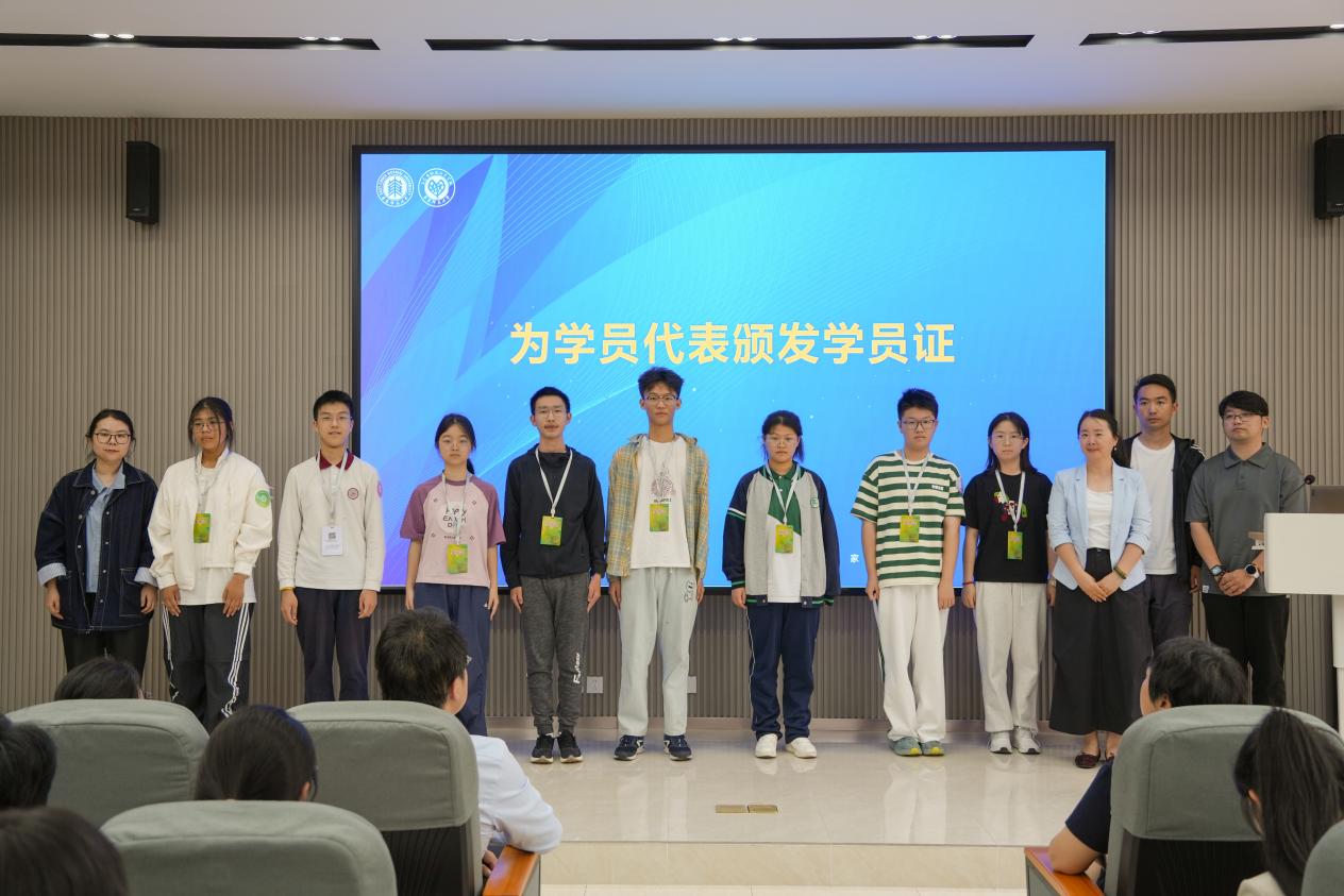 随后,实践点的教师代表张岳梅、吴承翰、王青波老师以及实践站秘书李引老师从120份学员证中随机抽取8名新生,现场为其佩戴学员证,也象征着科学精神的传递。陈小勇教授为新学员们寄语,希望他们能秉承科学探索精神,勇于实践,不断突破自我,成为未来生态文明建设的栋梁之才。