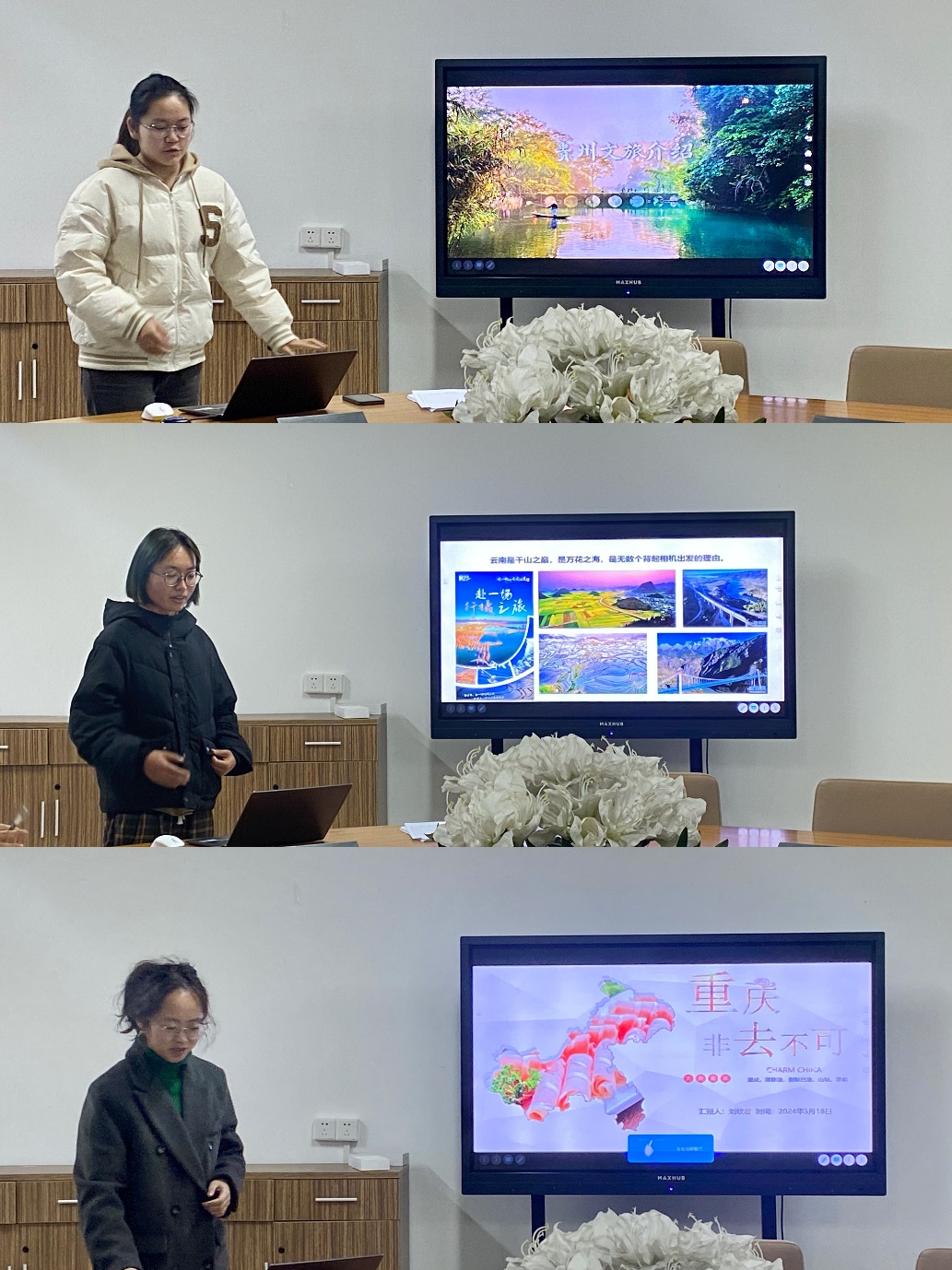 第三组是来自“云川贵渝”的赵悠朵、陈其睿和刘纹君。赵悠朵从“经济发展“出发,让我们感受到在新中国发展下的贵州翻天覆地的变化;陈其睿从“制定旅游攻略“的角度出发,向我们安利了云南各个旅游景点,让大家心之神往;刘纹君为大家带来了一堂重庆话的教学课堂,让大家对重庆方言有了新了解。