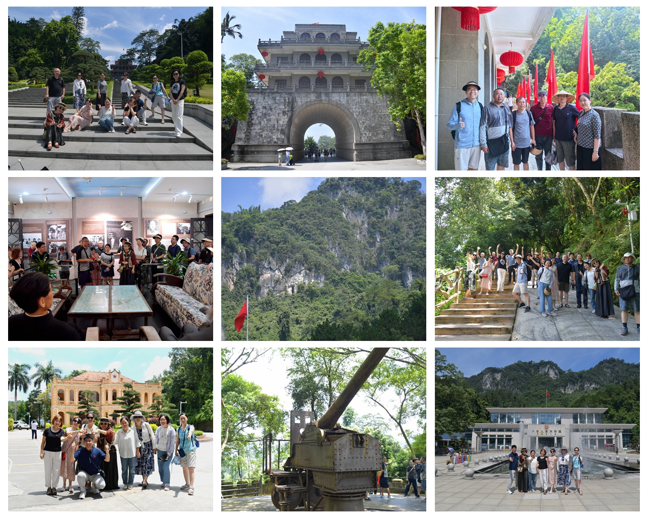 凭祥市与越南一市三县接壤,边境线长97千米,素有“中国南大门”之称。大巴车驶入凭祥后,映入眼帘的是一栋栋挂上五星红旗的房屋,让大家切身感受到浓浓的爱国之情。凭祥之行以“南疆国门第一关”友谊关为轴心。这座始建于西汉的古老雄关,见证了中法战争中的“镇南关大捷”和中国“不败而败”的屈辱历史。如今法式楼阁与中式城楼相融,斑驳的城砖上镌刻的不仅是金戈铁马,更有中越两国从兵戎相见到睦邻友好的沧桑巨变。沿着青石台阶拾级而上,指尖拂过被岁月浸染的城墙,极目远眺可见越南同登市的市井烟火。团队成员在"友谊关"三个遒劲大字前驻足留影,快门声里凝固着对历史的敬畏。参观左辅山镇关炮台时,老教授们看着远处的越南法卡山,将中越边境战争的烽火岁月娓娓道来,那些在猫耳洞的潮湿阴冷岁月,那以无数血肉之躯筑起的钢铁长城,都在诉说着一个民族永不褪色的精神图腾:山河虽无恙,吾辈当自强,致敬中越边境自卫还击作战中的英烈们。