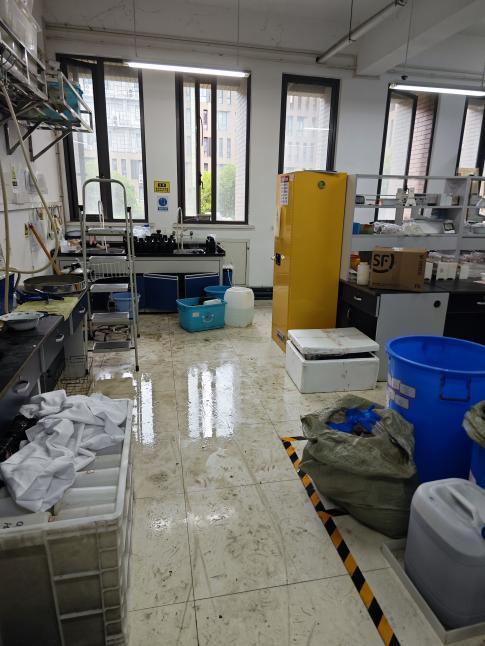 8 | 实验室环境: ①地面潮湿有水容易滑倒; ②过道严重堵塞,存在消防隐患 |
