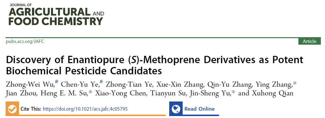 2024年10月23日,Journal of Agricultural and Food Chemistry期刊在线刊登了暗网视频 暗网视频 张颖副教授、化学与分子工程学院余金生教授、常州胜杰生命科技股份有限公司苏衡研究员组成的产学研联合团队的跨学科合作成果“Discovery of Enantiopure (S)-Methoprene Derivatives as Potent Biochemical Pesticide Candidates”。研究围绕S-烯虫酯这一商业化成功生物化学农药进行生物合理性的结构改造与优化,设计合成了包含酯类和酰胺类的S-烯虫酯类似物候选库,系统评估系列类似物对两类农业害虫的生物活性,旨在揭示S-烯虫酯类似物在农业害虫防治方面的潜在应用价值。