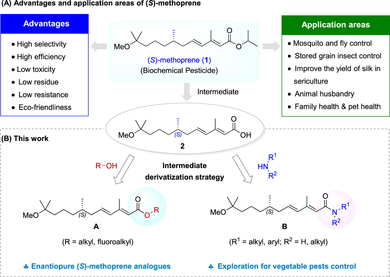 生物化学农药因具有比传统化学农药更高的生物特异性和生态友好性,已成为害虫防治领域中一类绿色和可持续的替代品。烯虫酯是一种昆虫保幼激素类似物,其中S构型是主要活性成分,能通过干扰昆虫生长和繁殖等发挥高效生物活性,被广泛应用于多种病媒害虫和仓储害虫的防控。但目前对烯虫酯的结构改造主要集中在外消旋体,对映体烯虫酯衍生物的生物活性研究,特别是对农业害虫的活性研究仍非常匮乏。