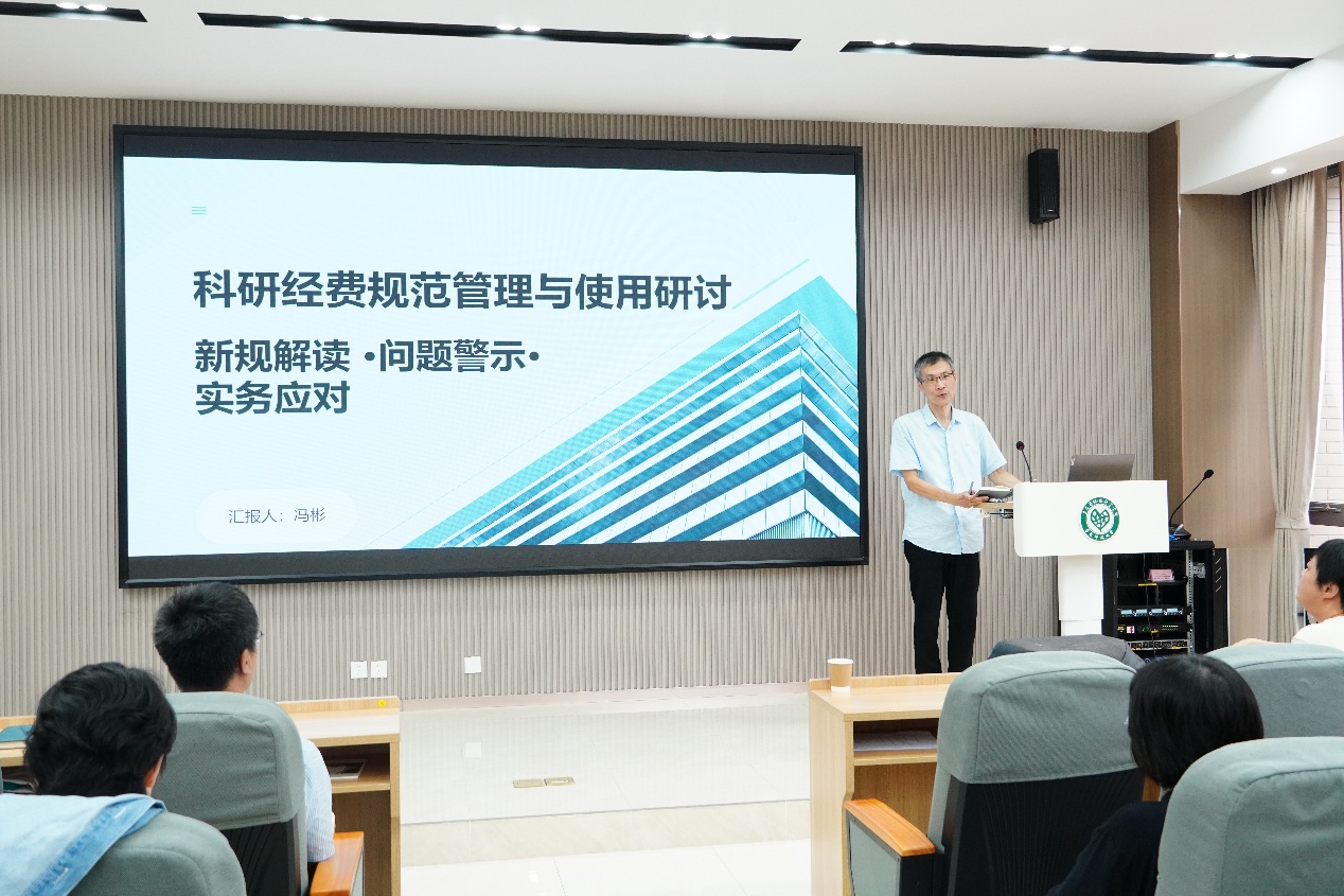 会议开始,冯彬老师围绕科研经费规范管理与使用作专题报告。他首先介绍了新管理办法的核心变化,包括简化预算编制与执行流程、扩大科研自主权、强化绩效导向等内容。结合新办法,冯彬进一步强调了当前主管部门关注的四大重点:严查经费使用的“相关性”与“真实性”;加强对外协转拨的监管,防范“以合作之名行套取之实”;重视预算执行的“严肃性”与“规范性”;强化绩效与诚信建设,突出成果产出与实际贡献。最后,他结合部分高校教师套取科研经费的处罚案例,重点阐述了研发项目“十不得”行为规范,警示科研工作者严守国家财经纪律。