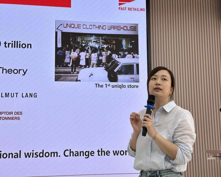 在本次分享会中,全球供应链HRSarah首先介绍迅销集团概况,明确全球供应链管培生这一岗位主要聚焦于产品生产的上游环节,并致力于实践优衣库“服适人生”的理念,即通过服饰为消费者带来更好的生活体验,积极倾听用户声音,不断优化产品。此外,她也强调迅销集团是一家具备长远发展目标的企业,拥有清晰的战略规划与数据目标,并在发展中持续改进、追求卓越。